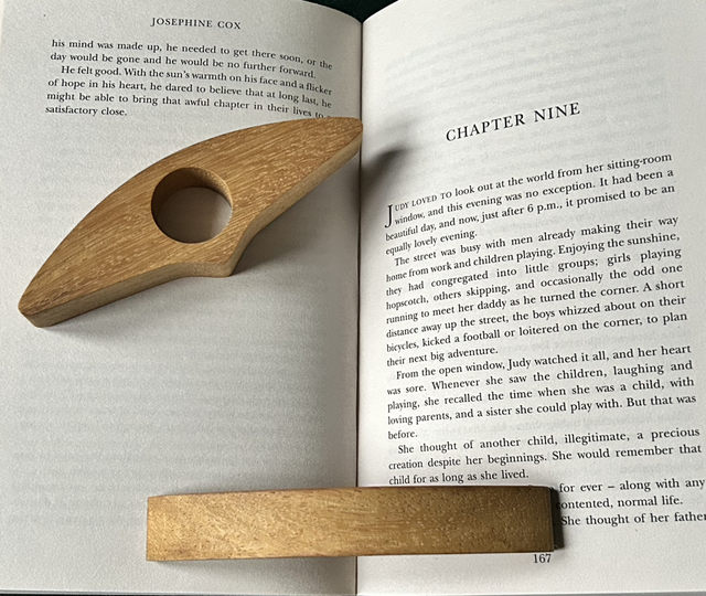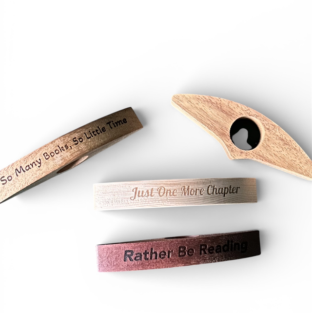 Wooden book thumb page holders designed to make reading more comfortable, allowing you to hold pages open with one hand. Ideal for paperbacks, hardbacks, and long reading sessions.